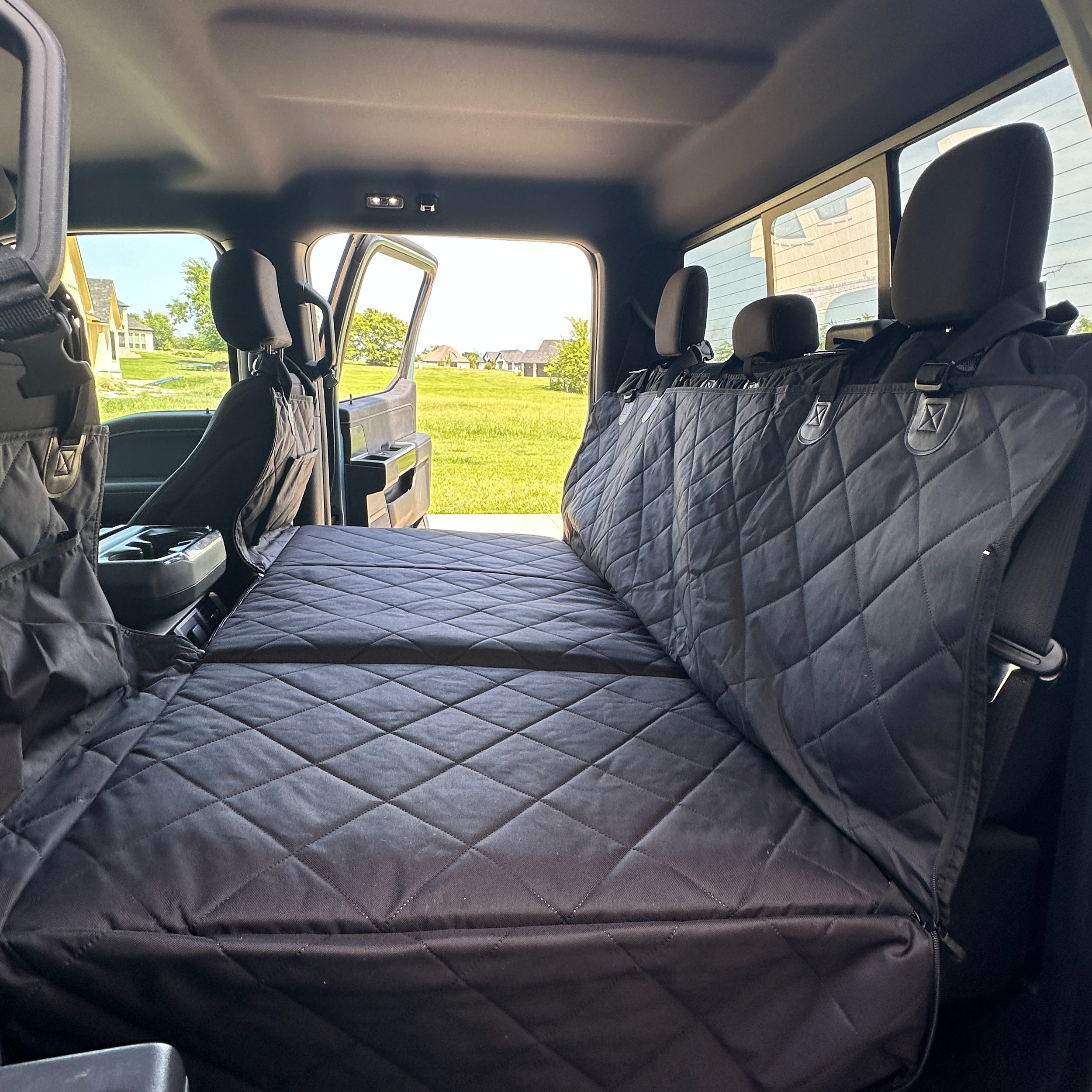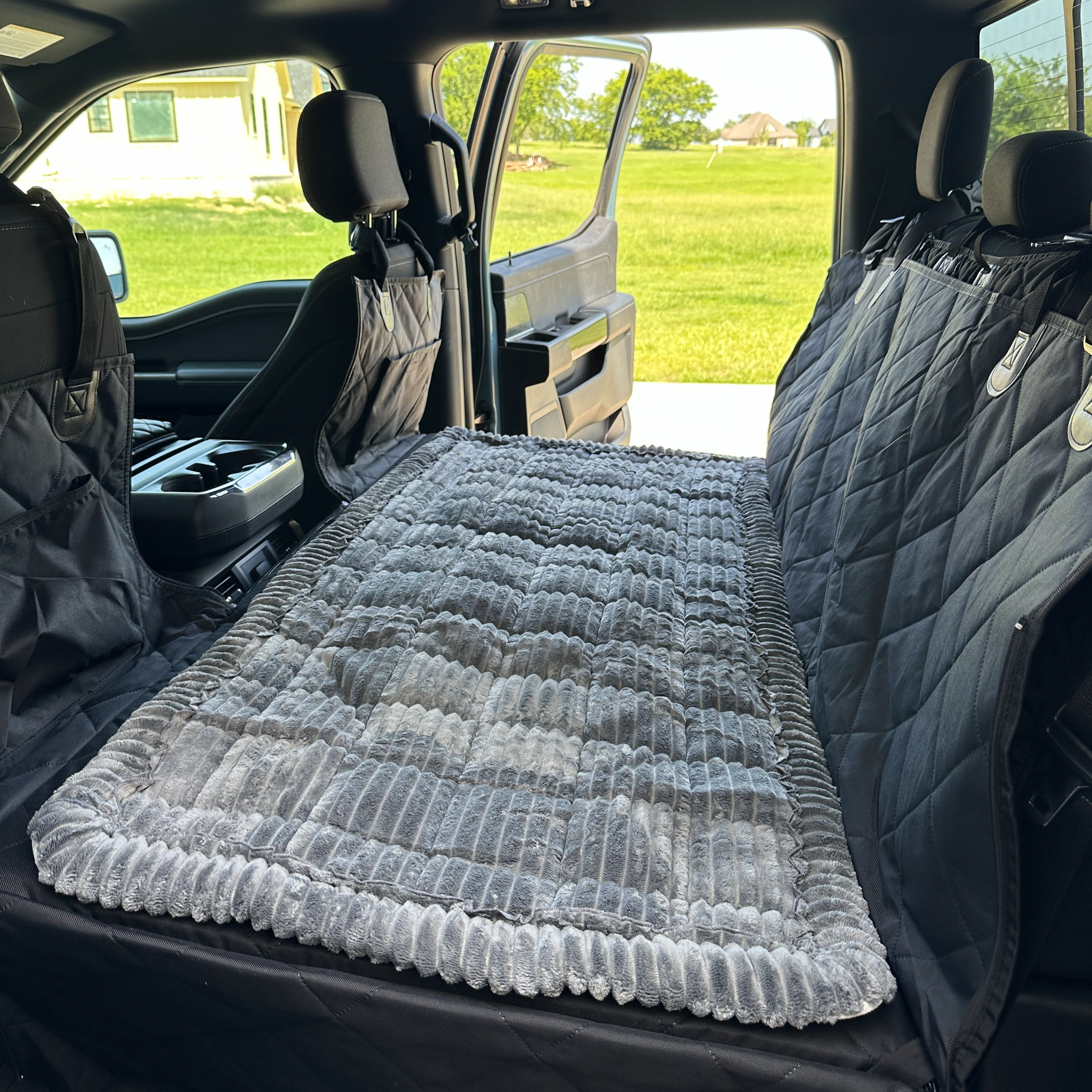 This platform is 30” wide so it fits the entire backseat of my F150. It’s sturdy and has a mesh liner between the seats that can zip up or down. And you can store things underneath. It’s going to be a game changer for traveling with dogs! I recommend the non-slip cushion to the right also as this is pretty hard and a little slick.