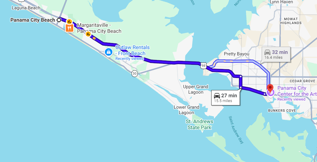 Drive just 20 minutes East (depending on the time of day, you can see here it says 27 minutes), and you hit Panama City. Panama City sits on Saint Andrews Bay, versus the Gulf. It’s protected by that row of barrier islands. So what does this mean?